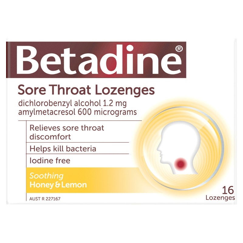 Betadine sore throat lozenges contain 2 antibacterial agents to help provide fast, soothing relief from the discomfort of sore throats, and helps kill bacteria that may cause a sore throat. Iodine free.