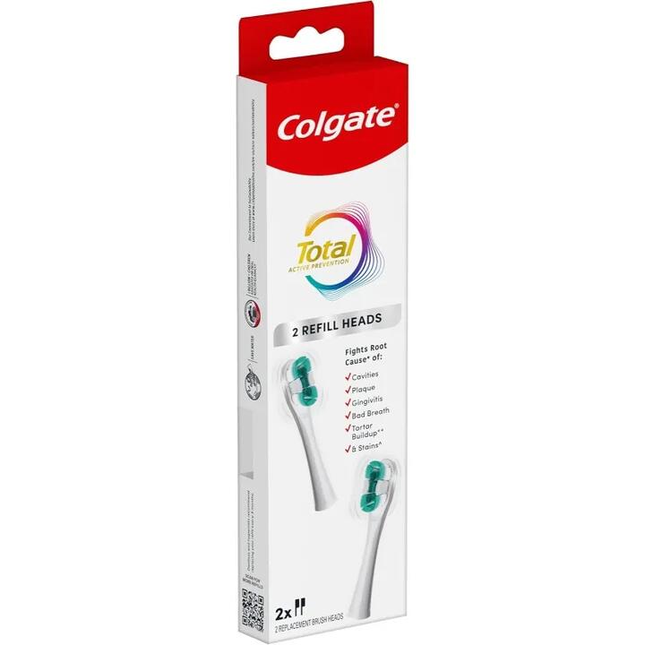 The Colgate Total Battery Replacement Toothbrush Heads Pack includes two replaceable toothbrush heads for your Colgate Total Battery Powered Toothbrush. These battery toothbrush heads help fight the root cause* of cavities, plaque, gingivitis, bad breath, tartar buildup**, and stains***.