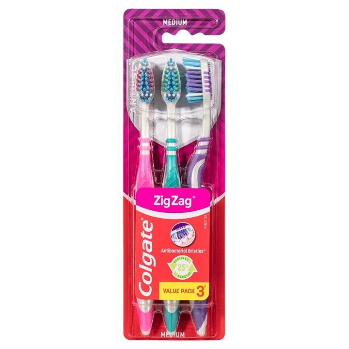 Colgate Zig Zag Medium Manual Toothbrush with antibacterial bristles (inhibits bacterial growth on bristles. The bristles do not kill bacteria in the mouth or protect you against disease), has angled bristles for interdental reach.