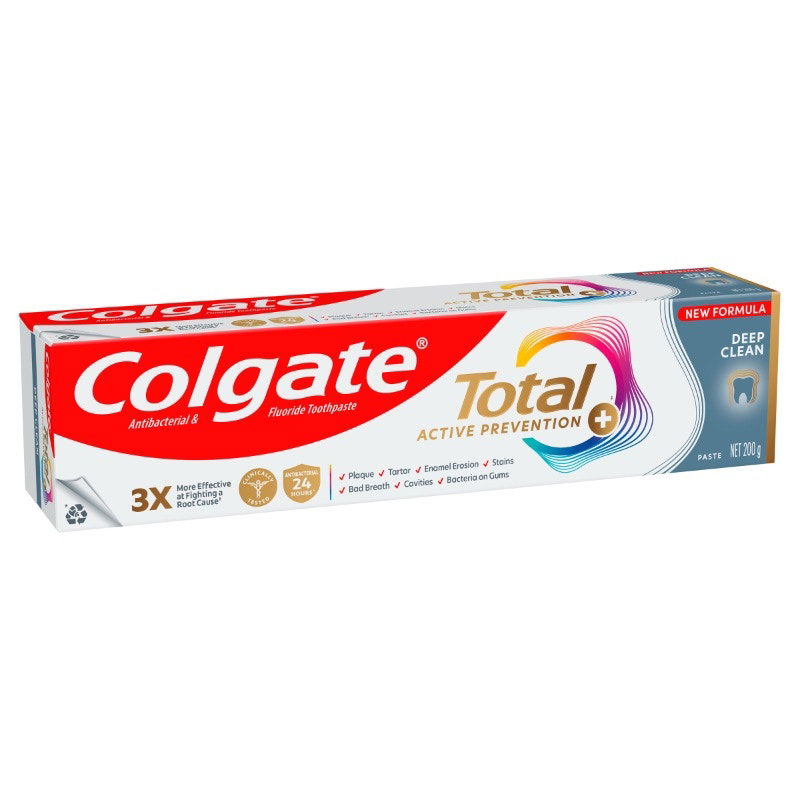 Colgate Total Active Prevention Deep Clean Toothpaste. Clinically Tested. 24 Hour Antibacterial Protection*. 3X More Effective at Fighting a Root Cause**. Rich, dense foam with high-cleaning microparticles helps prevent the formation of tartar along the gumline and on teeth.