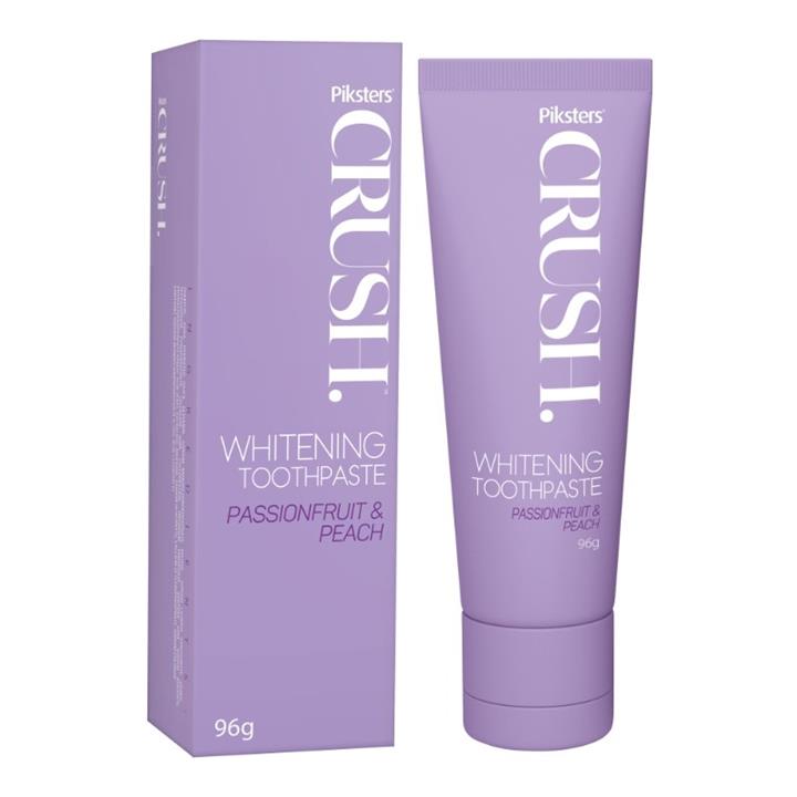 With each brush of Piksters CRUSH Passionfruit & Peach Whitening Toothpaste, enjoy a burst of flavoured freshness combined with PAP, an active ingredient used in professional teeth whitening products and full strength fluoride (1450ppm).
