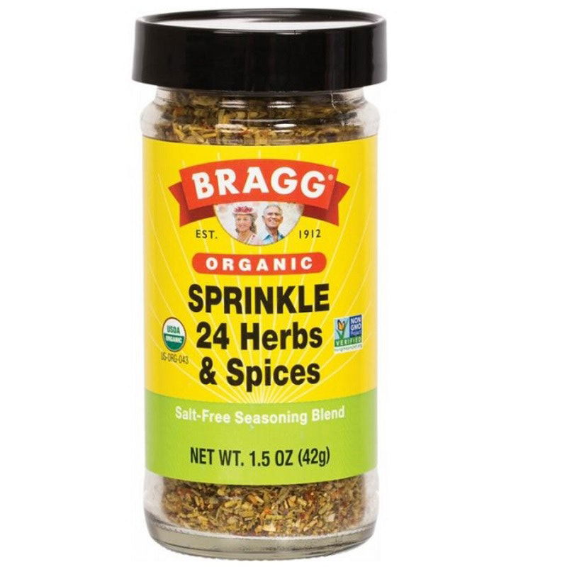 BRAGG Sprinkle is an original blend of 24 all natural herbs and spices by Paul C. Bragg, Health Pioneer and Originator of Health Food Stores. Bragg Sprinkle adds health and flavour to most recipes and meals.