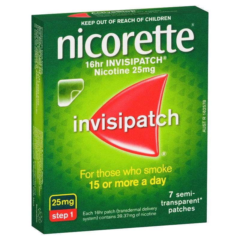 Nicorette InvisiPatch 25mg X 7 is a quit smoking aid. Nicorette 16hr Invisipatch patch works by relieving nicotine cravings and withdrawal symptoms.